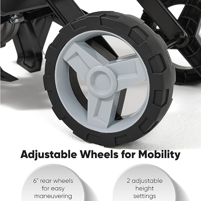 - CONTROLLED DEPTH AND SAFE OPERATION – Adjustable rear wheels let you set your tilling depth and improve stability, while the push‑button start and built‑in safety switch give you secure, hassle‑free control.