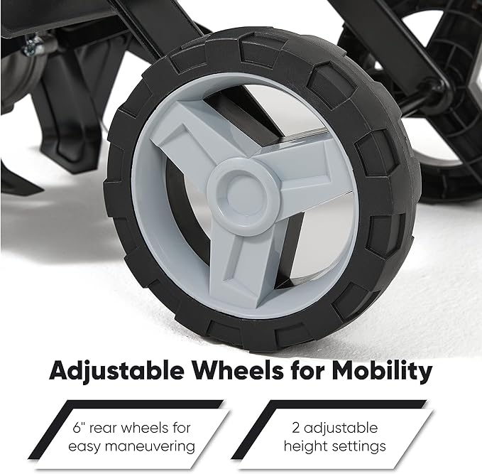 - ERGONOMIC & FOLDABLE DESIGN – Built with comfort and convenience in mind, the ergonomic cushioned handle reduces fatigue during extended use, while the 4‑position adjustable wheels let you control tilling depth with ease. When you’re finished, simply fold the handle down for compact storage in your garage or shed, saving valuable space.
