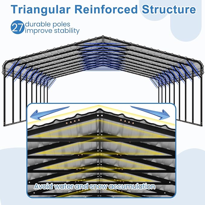 - Durability and Protection: Our carport features 27 reinforced cross beams, 18 rust-resistant powder-coated 2''x2'' steel poles, and a high-strength galvanized steel roof with 0.5 mm thick panels. The roof includes a drainage system for smooth runoff, and the joints are sealed with waterproof tape to prevent leaks