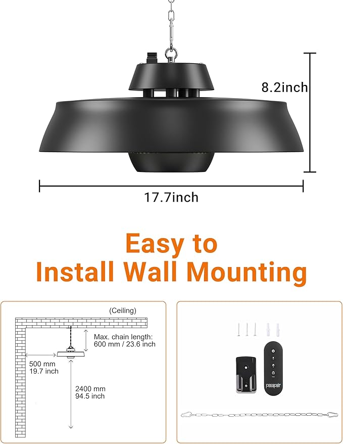 Pasapair Patio Heater - 1500W Outdoor Hanging Heater 3S Fast Heating with Remote - Adjustable Height Waterproof Infrared Mounted for Gazebo Garage - ETL Certified
