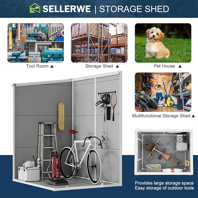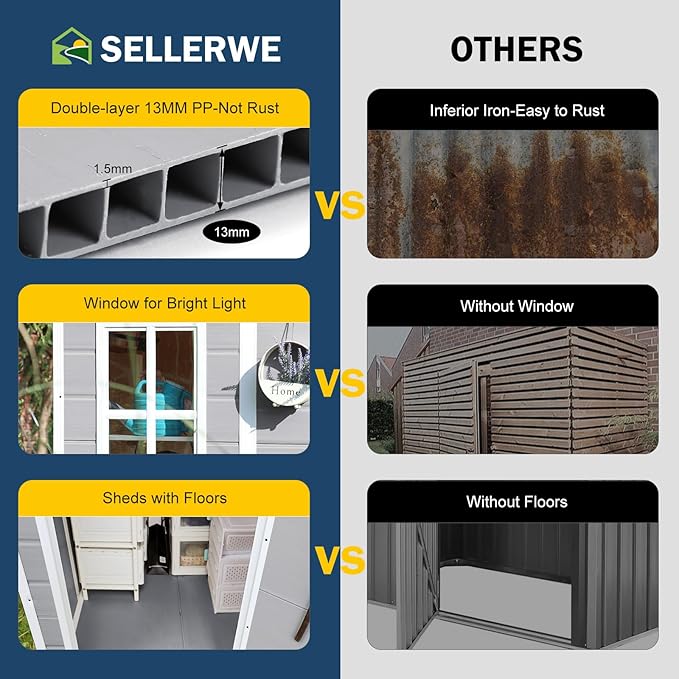 - 🏡[PREMIUM MATERIAL STORAGE SHED WITH FLOOR]: The 12mm tough double-wall resin construction and impact-resistant floor are designed for long-term durability. The double-wall panels are waterproof and moisture-proof, allowing worry-free use in all weather conditions. It is weather-resistant, waterproof, and UV-resistant—no peeling, rotting, or rusting. The screws are embedded to ensure aesthetics and safety.