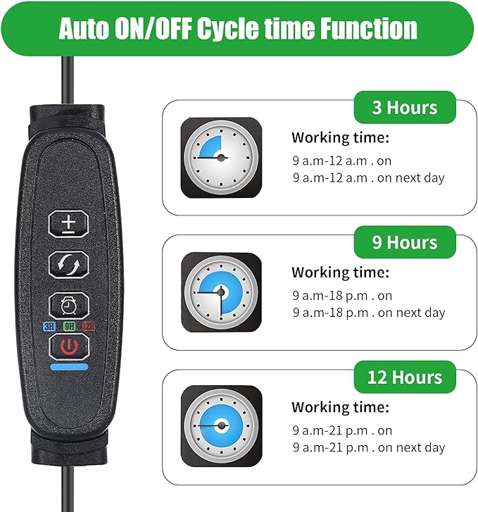 - 【Auto On/Off Timing Function】The plant grow light comes with a cycle memory timer function, which can Auto turn on/off every day according to your settings: 3/9/12 hours, the grow light will Auto turn on and off at the same time the next day, no manual operation is required, you can take care of your plants when you on work or vacation.