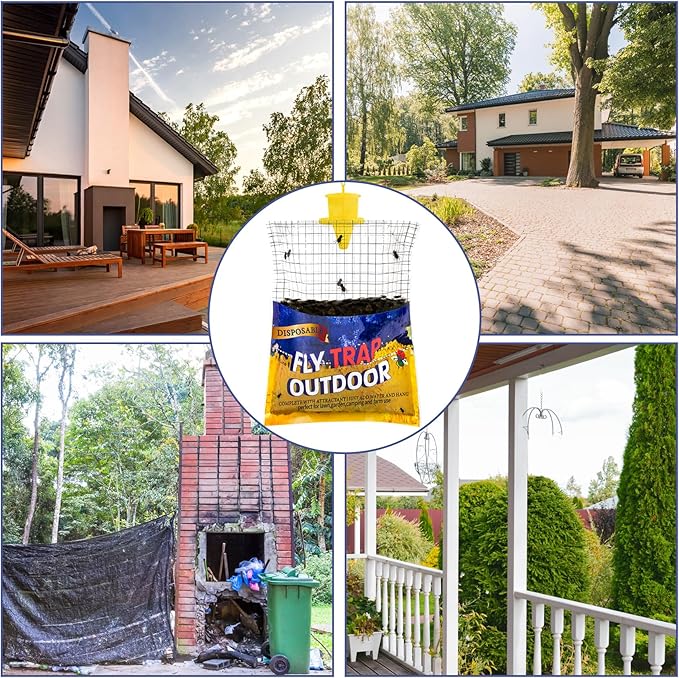 - Disposable fly traps bags hanging: science has proved that flies prefer yellow and blue, so the new fly repellent package to efficiently attract. Secondly, through the taste of outdoor fly trap natural fly bait, which is difficult for us to accept, but flies cannot resist