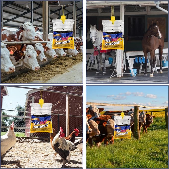 - Only using fly traps outdoor: keep fly traps outdoor hanging at least 20 feet away from living areas. The fly hunter killer is suitable for well-ventilated places such as farms, garden, vegetable markets, garbage stations, etc. Fly control also can be place at chicken coop, livestock, pasture, cattle, barn, etc