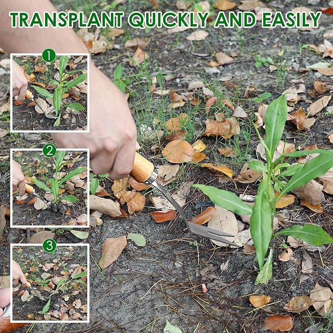 - [Premium Construction] Made of industrial-grade stainless steel that resists rust, corrosion, and bending, ensuring years of reliable service even in wet soil conditions. And the handle of the garden tool set is crafted from wood for a easy grip and long service life.