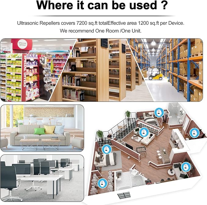 - Wide coverage: Its ultrasonic wave can cover an area of 80 to 120 square meters. Since ultrasonic waves cannot penetrate walls and solid objects, it is recommended to put one in every room