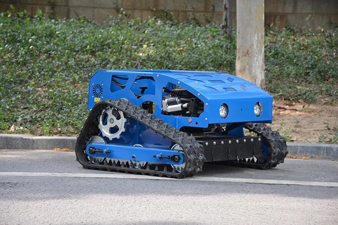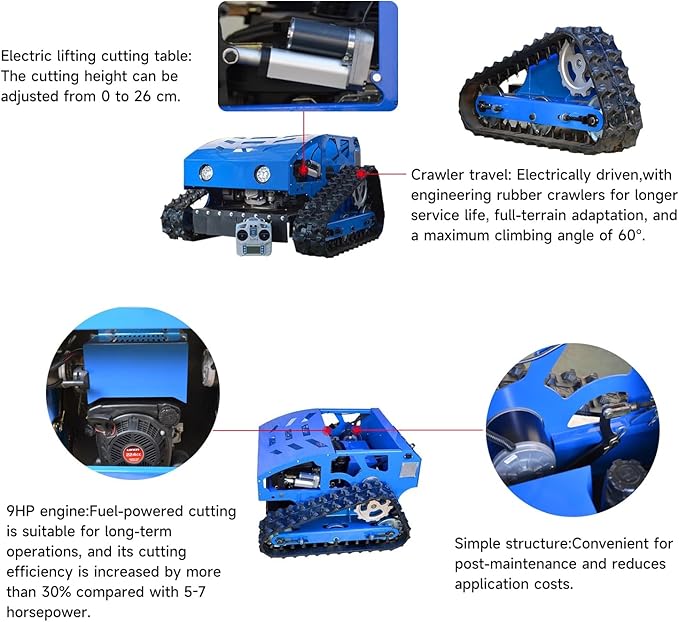 - 【All-Terrain Adaptability】 rubber track design, maximum climbing degree 60°. Large private gardens, villa lawns, farms, orchards, golf course edges, park maintenance, hillsides and ditch areas with complex terrain
