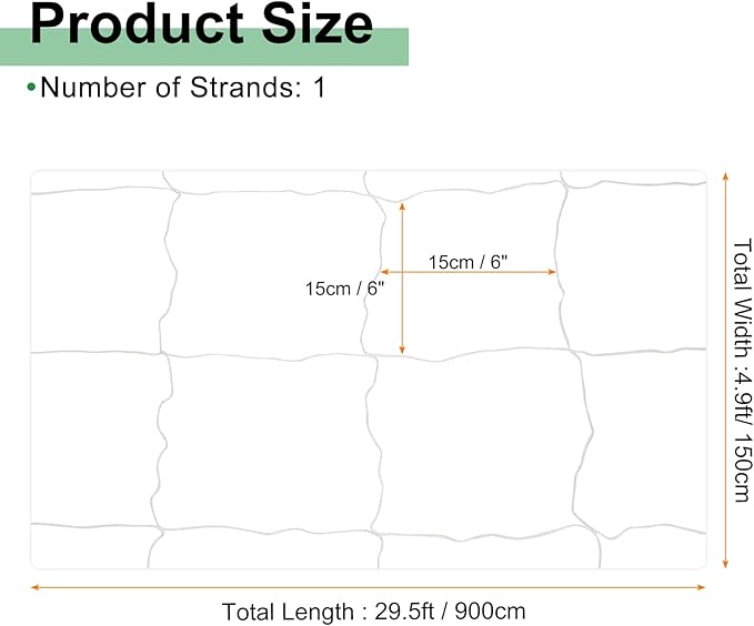 - Size - Total Size: 29.5ft x 4.9 ft / 900cm x 150cm (L*W), Mesh Size: 6"x6" / 15ft x 15cm (L*W), Number of Strands: 1, Color: White.