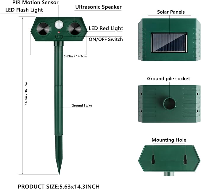 - Safe & Human Design You can simply insert the animal repeller into the ground or hang up where there is plenty of sun light and switch it on, which is perfect for yard, patio, garage, attics, porches, boats, garden, farm, pond, etc. Besides, it is mini enough for you to take it to outdoor, such as camping.
