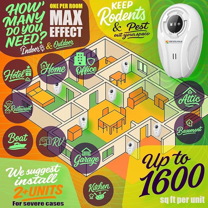 RX-78, Ultrasonic Pest Control Repeller - Electronic & Ultrasound, Indoor Plug-in Repellent - Get rid of - Rodents, Mice, Squirrels, Bats, Insects, Bed Bugs, Ants, Fleas, Spiders, Roaches (4Pack)