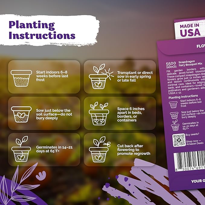 - Easy Start: Sow dwarf snapdragon seeds indoors 6-8 weeks before last frost, then transplant 6" apart, or plant directly early spring or late fall; seeds for planting flowers mature quickly for early blooms in containers & borders gardens.