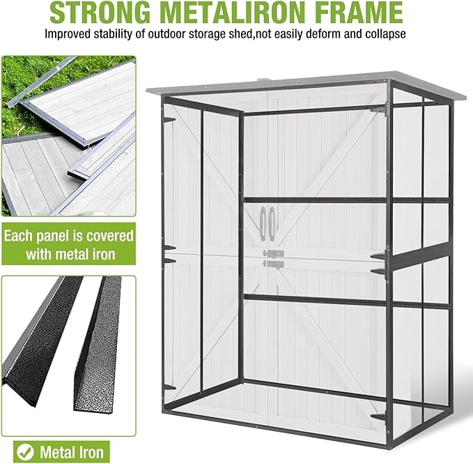 GUTINNEEN Outdoor Storage Shed with Metal Frame,Wooden Tool Cabinet with Adjustable Shelfs, House Garden Shed for Backyard Garden Patio Lawn