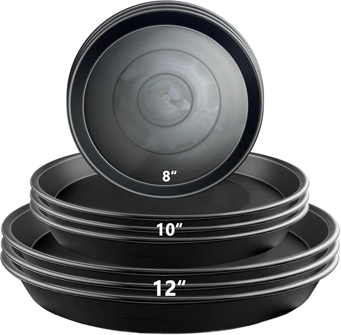 - 【9 Pack Multi-Size Plant Saucers】 Includes 9 pcs durable plant saucers: 3 × 8 inch (8.27" outer dia, 6.81" inner dia, 1.1" height, 70g each), 3 × 10 inch (10.43" outer dia, 8.94" inner dia, 1.18" height, 133g each), and 3 × 12 inch (11.61" outer dia, 10.04" inner dia, 1.26" height, 163g each). Suitable for small, medium, and large flower pots. Manual measurement may cause slight differences, but will not affect normal use.