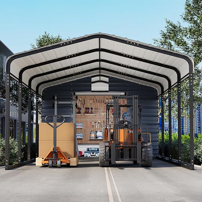EROMMY 12x25 FT Carport Storage Shed 2-in-1, Heavy Duty Car Port with Galvanized Metal Frame, Base-Reinforced Enclosed Storage Shelter, Extended Coverage for Trucks, Cars & All Vehicles, Gray