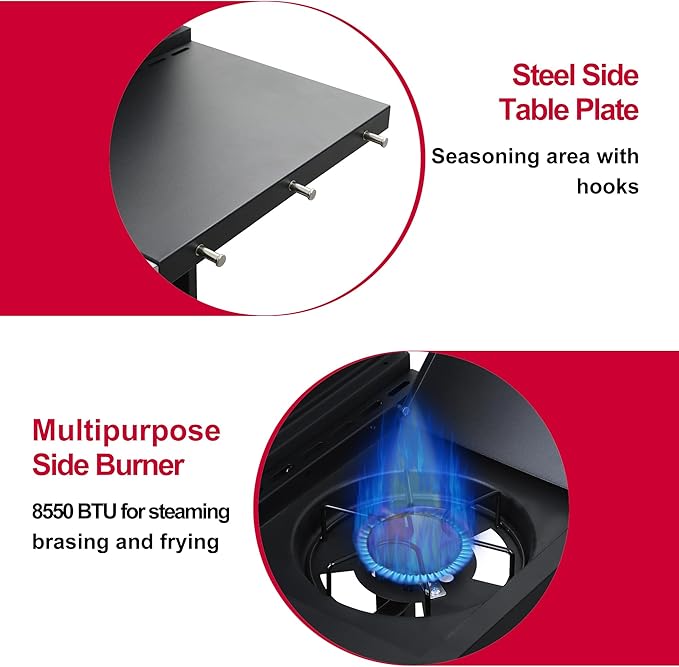 - High BTU Output & Auto Ignition: This 3-burner gas grills with side burner features a total 37330 BTU output (three 9560 BTU main, one 8650 BTU side burner) with three 7.8 x 14.3-inch enameled cast iron cooking grids. Integrated auto-ignition allows for quick, easy startup.