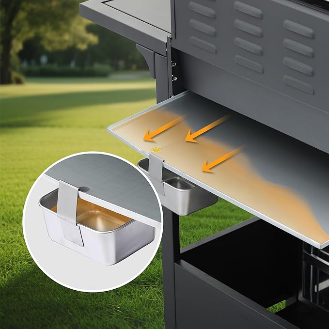 - Durable Material Construction: Built with a steel firebox (550Β°C high-temperature powder coating) and 430 stainless steel components: warming rack, stainless steel thermometer, flame regulator, control panel, and double-layer front door for long-term use.