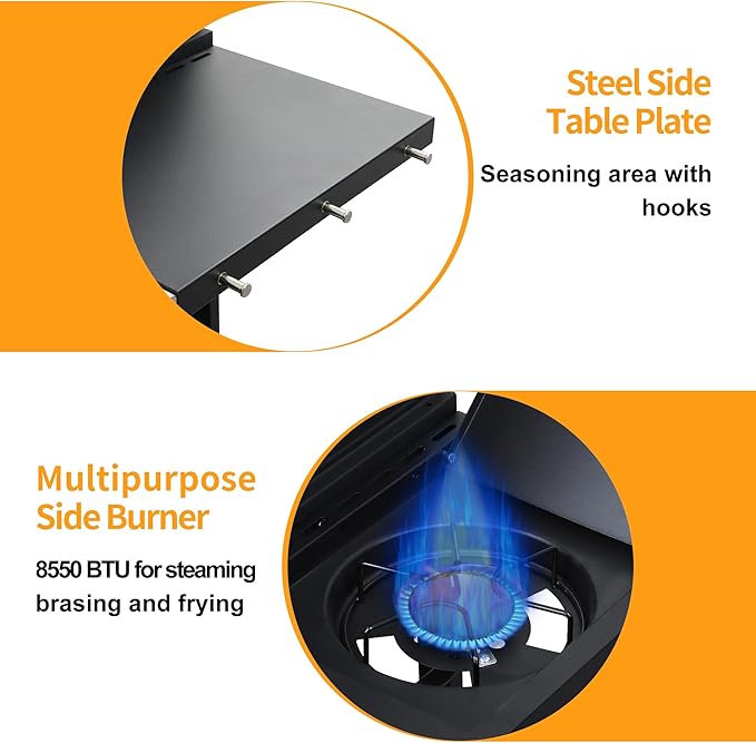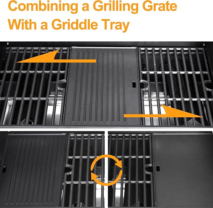 - High BTU Output & Auto Ignition: This 4-burner gas grills with side burner features a total 46890 BTU output (four 9560 BTU main, one 8650 BTU side burner) with three 7.8 x 14.3-inch enameled cast iron cooking grids. Integrated auto-ignition allows for quick, easy startup.