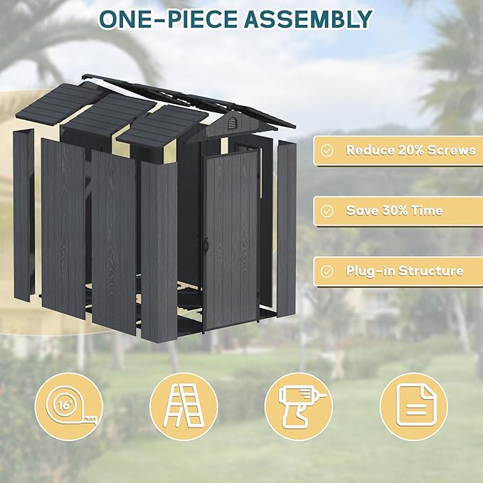 - Weatherproof & UV-Resistant: Waterproof, rust-proof, and UV-protected, this resin shed prevents damage from rain, snow, and sun exposure. The sloped roof design avoids water pooling, keeping your belongings safe and dry.