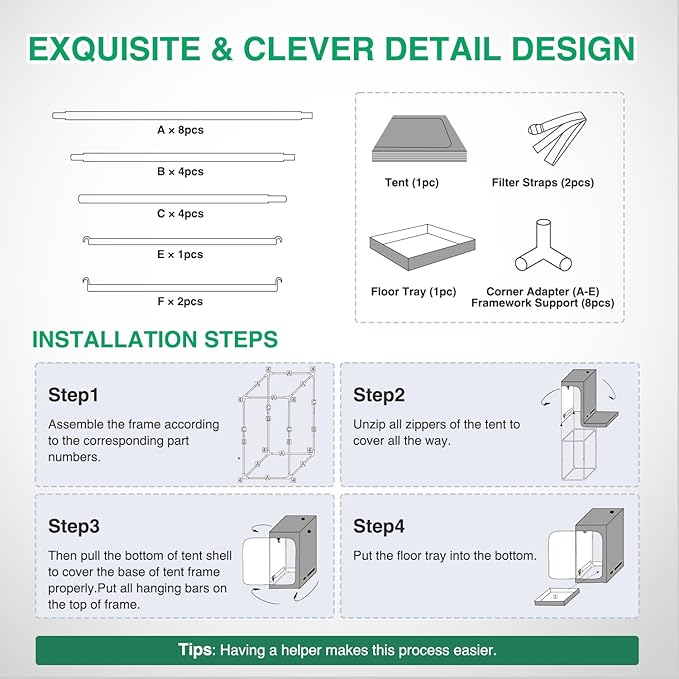 - EASY TO ASSEMBLE & MAINTAIN: This 48"x48"x80" grow tents has a simple design, and the detailed instructions allow you to assemble it without tools in a few minutes. Built-in portable tool bag, you can store some gardening tools for convenient use; the detachable ground tray can help you collect spilled soil and water to prevent moisture, making cleaning and maintenance a breeze
