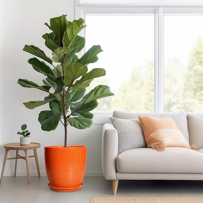12 Inch Pots for Plants - Ceramic Plant Pots with Drainage Hole and Saucer, Modern Planter for Indoor Outdoor, Round Flower Planters, Porch Home Garden Decor, Gifts for Women, Orange