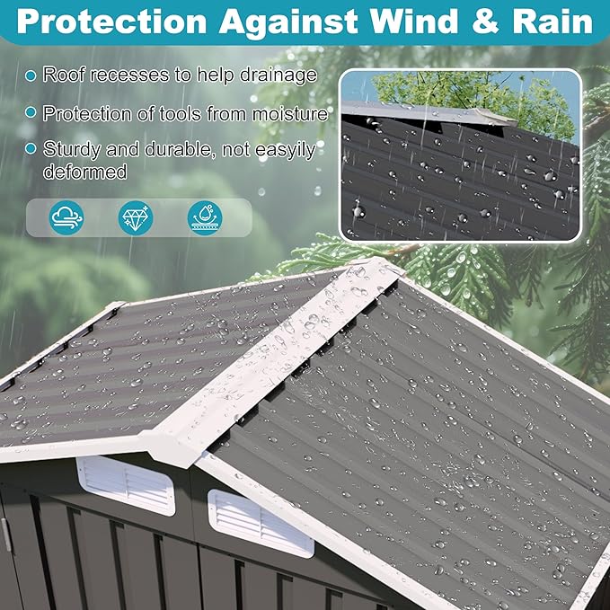 - Durable Galvanized Steel Construction: Made from prepainted, rust-resistant galvanized steel panels with a sealed roof and wind-resistant frame. Compared to wood or plastic sheds, metal offers superior strength, reduced maintenance, and long-term reliability.