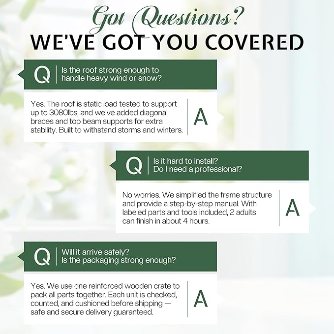 - Quick Assembly in 4 Hours: Labeled parts, pre-drilled beams, and instructions make installation easy. Two adults can finish in 4 hours β no pro needed