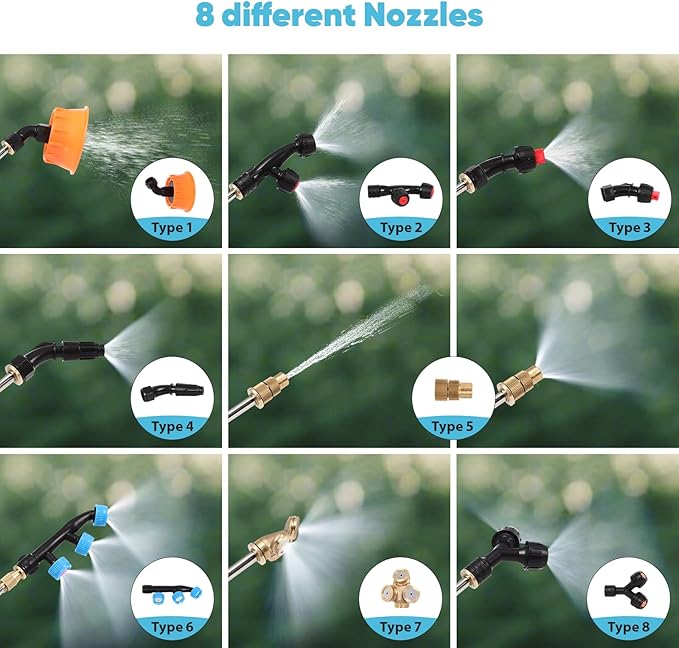- 【Perfect Set】Contains 8 different nozzles, you can use the appropriate nozzle according to your needs for your convenience. It also includes a variety of accessories such as the mouth cover filter, wide mouth cover and measuring cup, and a retractable spray wand. These practical accessories can make the sprayer more widely used, greatly enhance your experience of using the backpack sprayer, and make work easier and more enjoyable!