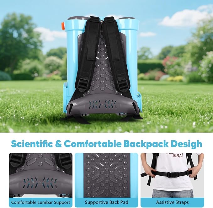 - 【Comfortable backpack sprayer】Equipped with durable padded shoulder straps, comfortable lumbar support, and auxiliary waist buckle belt. Improve your working comfort and allow you to focus on your work. It also comes with an integrated handle for easy carrying.