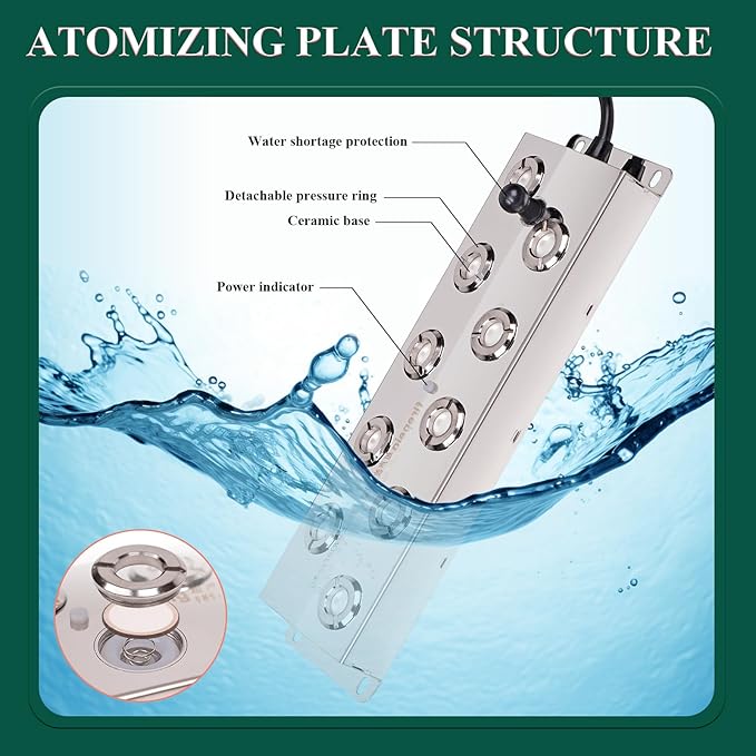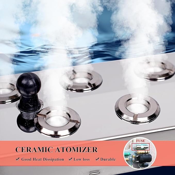 - Independent Nozzle Protection: Our Ultrasonic Mist Maker is equipped with 10 independent fuses, ensuring continuous operation even if one atomizer head fails, providing reliable and uninterrupted mist output for your fountain or pond.