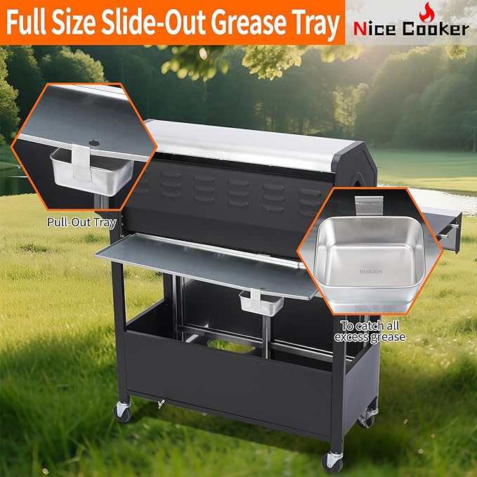 - Powerful Cooking Output: Our Nice Cooker 6-Burner Propane Gas Grill delivers a robust 65850 BTU total output, with each main burner providing 9550 BTU and the side burner 8550 BTU, ensuring even heat for all your grills outdoor cooking needs.
