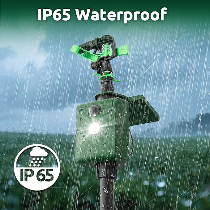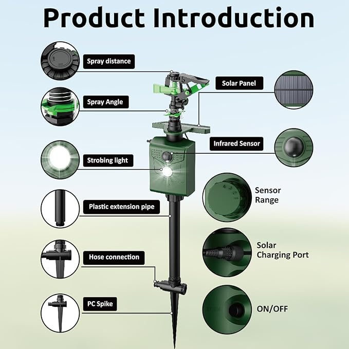 - 【Smart Animal Repellent with PIR Sensor】Automatically sprays water & flashing light when motion is detected, effectively scaring away deers, cats, dogs, foxes, skunks, raccoons, and other pests from the garden.