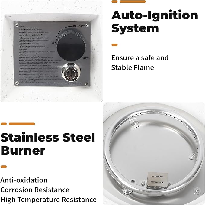 - 【Powerful 50,000 BTU Heat with Enhanced Safety】Stay cozy with a gas firepit for outside patio delivering 50,000 BTUs of heat. Equipped with electronic auto-ignition and emergency auto-shutoff, this CSA-certified propane fire pit table ensures safe, worry-free use, ideal for a patio fire pit table or outdoor gas fire pit that extends your outdoor enjoyment into cooler evenings