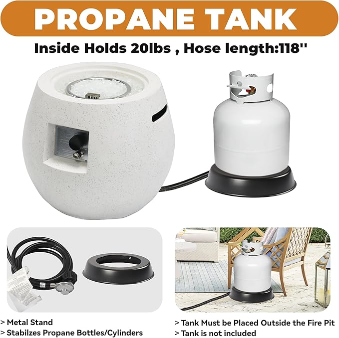 - 【Complete Accessories for Convenient Outdoor Use】Included accessories enhance both style and usability: glass beads, lid cover and durable rain cover. The propane tank fits discreetly inside the fire pit base, keeping the setup clean, safe, and convenient for entertaining or relaxing