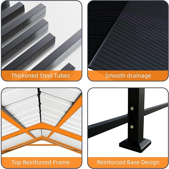 - Reinforced Steel Frame and Roof Panels Constructed with a rust-resistant steel frame and galvanized steel roof panels, this carport is built to withstand long-term outdoor exposure. The vertical roof design improves drainage and enhances durability for all-season coverage.
