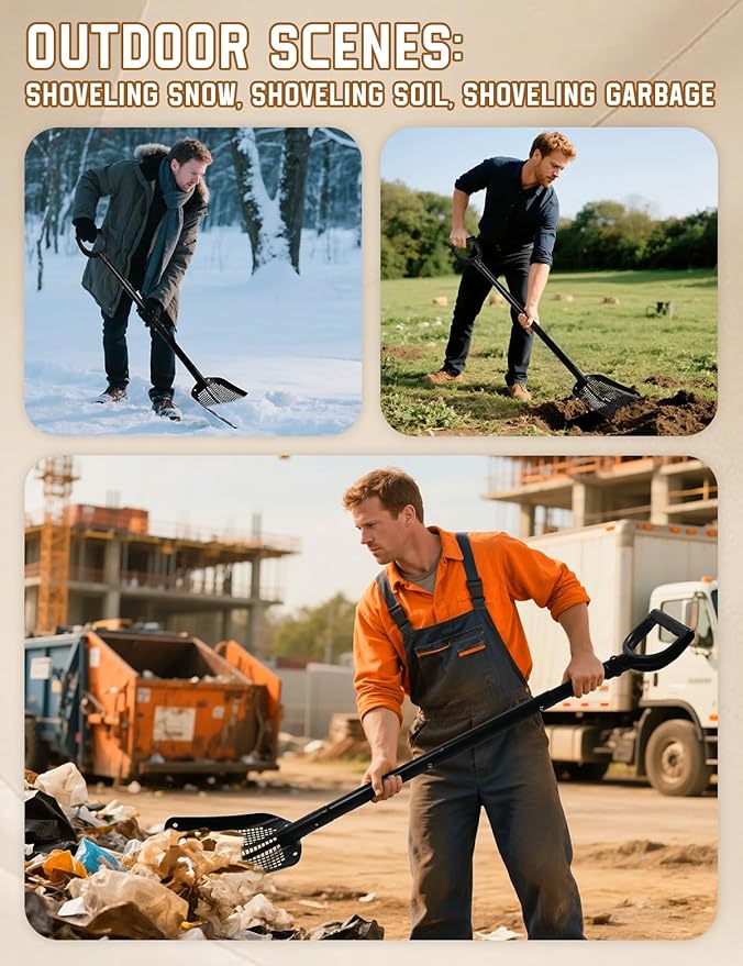 - 【Efficient Square-Hole Design】The shovel head is engineered with precision square punched holes, allowing sand, dirt, and small debris to pass through quickly while holding larger waste and rocks. A practical and efficient sifting shovel for beach, garden, and farm cleaning