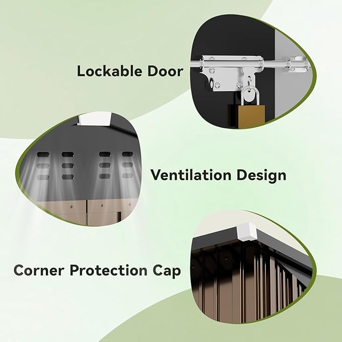 - Lockable Door and Vents:The lockable door provides security,keeps your tools away from being stolen,and avoids small animals from entering accidently;Two Top Vents for Better Airflow,Keeping the Space Cool and Odor-Free