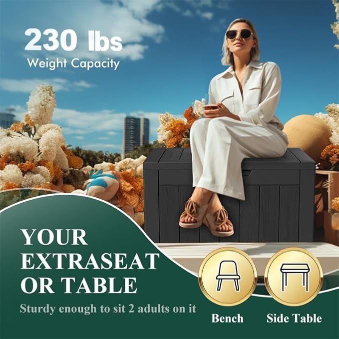 - ADAPTABLE TO VARIOUS SCENES: Whether used as an indoor laundry storage chest or an outdoor deck box container for items like outdoor cushions, garden tools, pool accessories, and sports equipment, this patio storage box provides abundant space. It's also versatile as a side table, yard seat, storage bench, or footrest