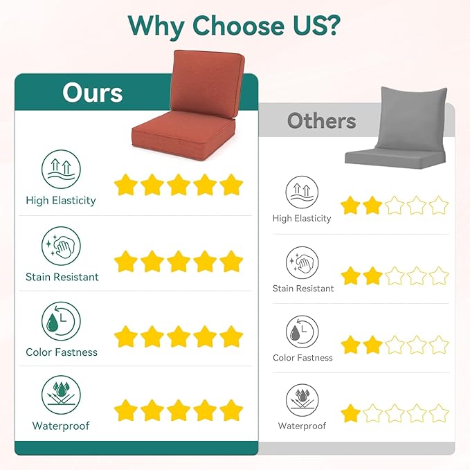 - Waterproof & Fade Resistant: Made from high-quality polyester Oxford fabric with double-layer waterproof treatment, these outdoor patio cushions provide excellent water resistance—ideal for rainy days or unexpected spills. They also offer reliable fade resistance, helping maintain their vibrant color over time