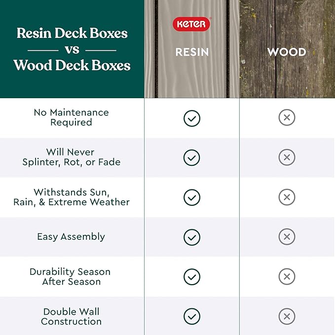 - DURABLE & ATTRACTIVE RESIN CABINET: This deck storage box is attractive and rugged and is made from strong, durable resin with a wood-plank look. It has an easy-lift mechanism for an effortless open and a quiet close.