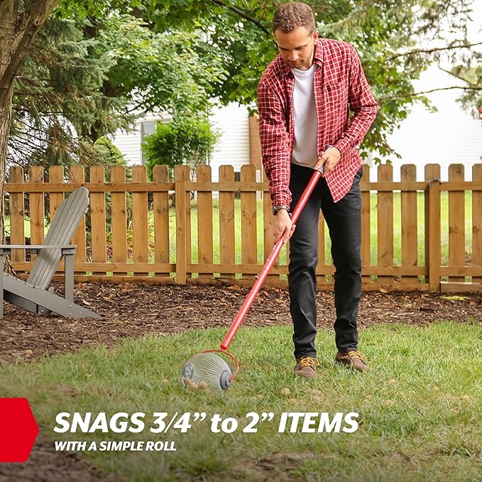 - STRONG AND COMFORTABLE Built with a rust-resistant, carbon steel frame and ergonomic rubber handle, this acorn picker upper roller is ready for rugged all-day cleanup without hand strain