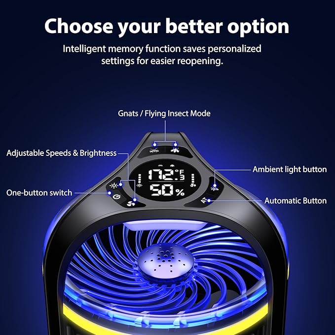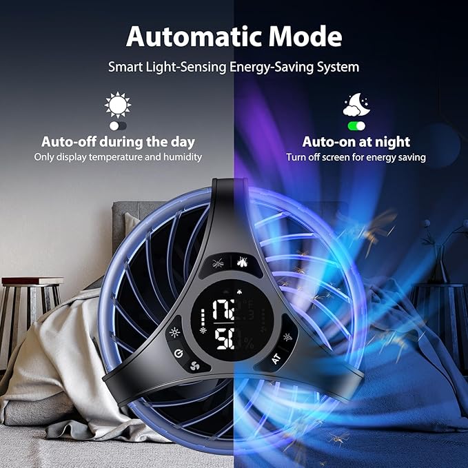 - â ăIntelligent FunctionăThis fly trap indoor not only features a real-time temperature and humidity sensor to monitor the indoor environment and help improve air quality, but also includes an automatic mode that runs intelligently at night and shuts off during the dayâenhancing capture efficiency while saving energy.