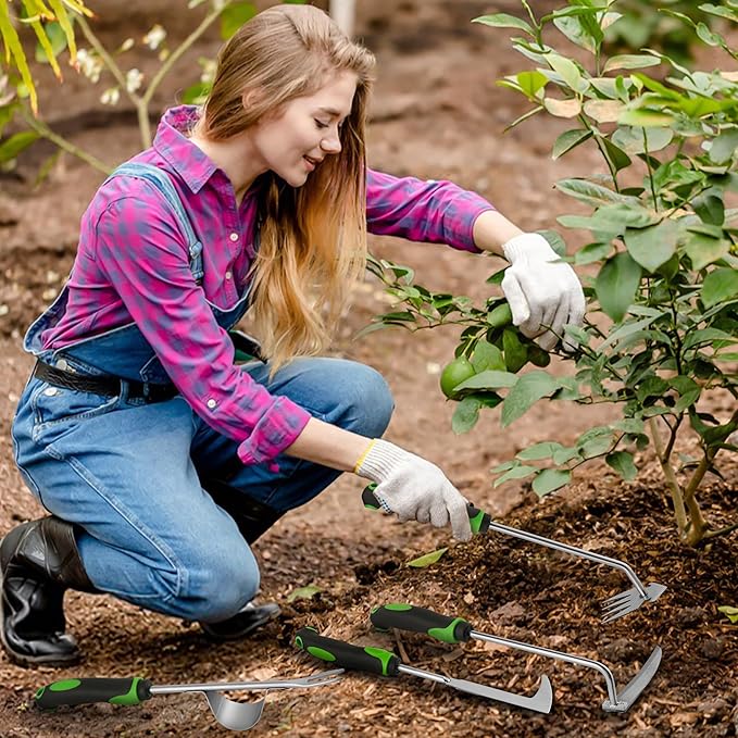 - 4 Pack Weeding Tools: The weeding tool set includes 4 hand weeder tool with different shapes: L-shaped crack weeder*1, V-shaped uprooting hand weeder*1, 4 teeth weed puller*1 and weeding sickle*1. Our garden weeder tool is designed with ergonomic rubber handle. The weed puller tool are made of high quality stainless steel that is both sturdy, polished, not easy to break and deform