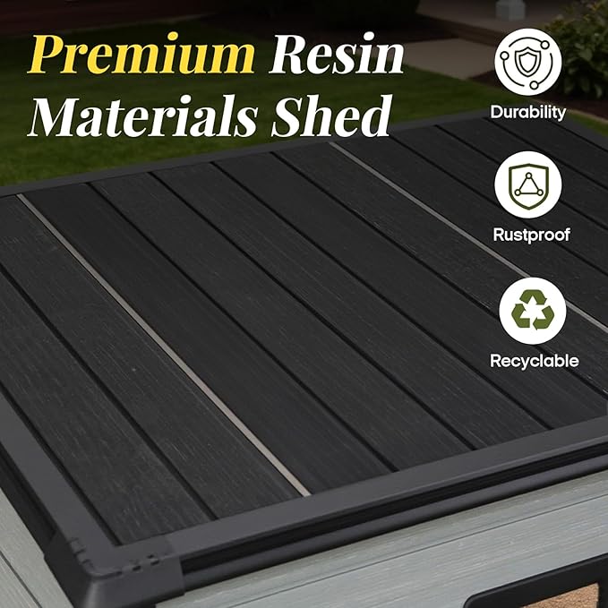 - Spacious Plastic Storage Shed with Floor: This outside shed storage with floor offers ample space for organizing garden tools, bikes, and other essentials. Its thoughtfully designed interior keeps everything dry and protected from the elements, while the double-layer resin material ensures durability.
