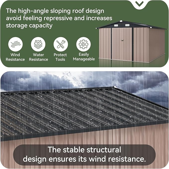 - Engineered Design for Protection & Security: Features a practical, water-shedding sloped roof that prevents pooling and leaks while maximizing usable interior height. Integrated ventilation ensures crucial airflow to reduce moisture buildup and protect stored items. The sturdy, lockable door provides convenient access and essential security for your valuables, giving you peace of mind.