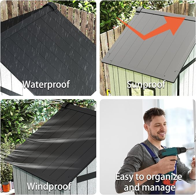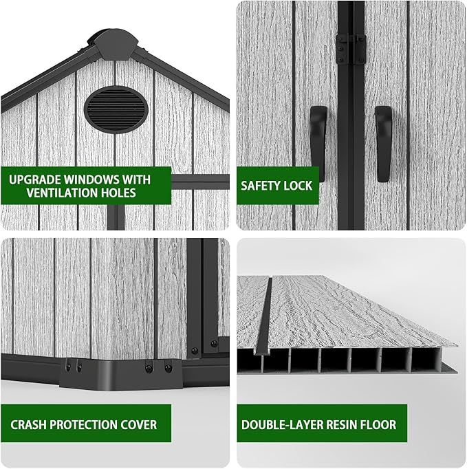 - Robust Double-Layer Floor : The double-layer resin floor provides strong support for heavy machinery and resists abrasion. This ensures your tools and lawn equipment remain protected and the shed stays stable on level grounds.