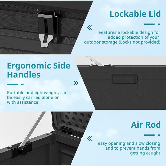 - LOCKABLE LID & USER-FRIENDLY DETAILS:Safety meets convenience with a lockable lid (padlock not included) that keeps your items protected from unauthorized access. Smooth-opening metal support rods help prevent accidental closure, while built-in side handles make repositioning this resin storage box simple and safe