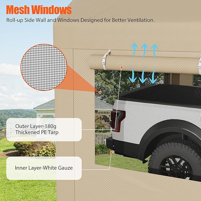 - 【Removable Sidewalls Window and Doors】This carport shelter has 2 removable sidewalls with Roll-up Ventilation Windows. It can help with airflow, and prevent moisture. It also has two removable doors with zippers. You can roll the doors up or down as you wish. Or remove all the sidewalls and doors, only leave the canopy cover on for outdoor activities.