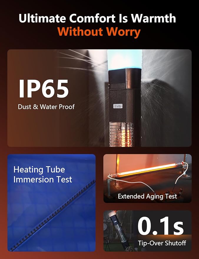 - [Warmth x Safety] – Just enjoy the warmth without worry. With IP65-rated water and dust resistance, this outdoor heater stands strong even in rain or snow. It also features tip-over auto shut-off for added protection. Every unit is made from V-0 rated fire-resistant materials and has received SGS safety certification. All to ensure a tough and reliable product.