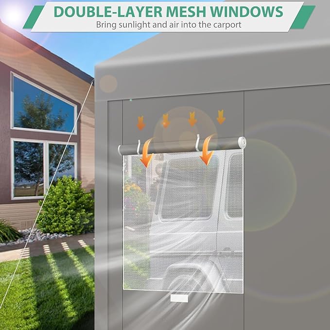 - 【Good Ventilation】 Our portable garage is equipped with four roller shutter mesh windows and two zippered doors on two side walls, which enhance airflow, reduce moisture accumulation, and create a comfortable internal environment.