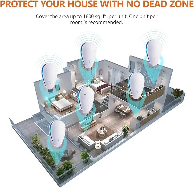 - Drive Pests Away Efficiently: the mice repellent ultrasonic plug-in uses ultrasonic waves to irritate pests' brain and auditory systems, creating an uncomfortable environment that effectively drives away fleas, rodents, insects, mosquitoes, ants, bed bugs, and more